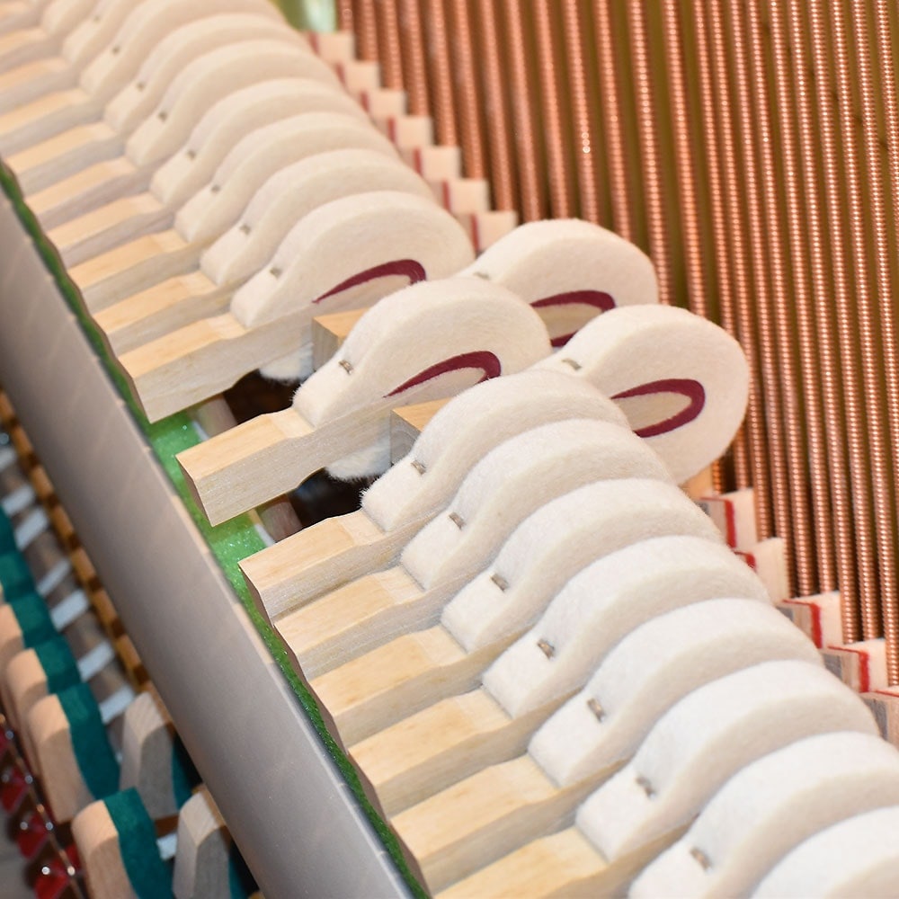 すべてのハンマーにアンダーフェルト入りハンマーを採用。 ふつうのフェルトの下にもう一枚フェルトが巻かれているため、ハンマーの内部をより硬くすることができ、より重量を持たせられるので、いっそう豊かな音量と響きが得られます。