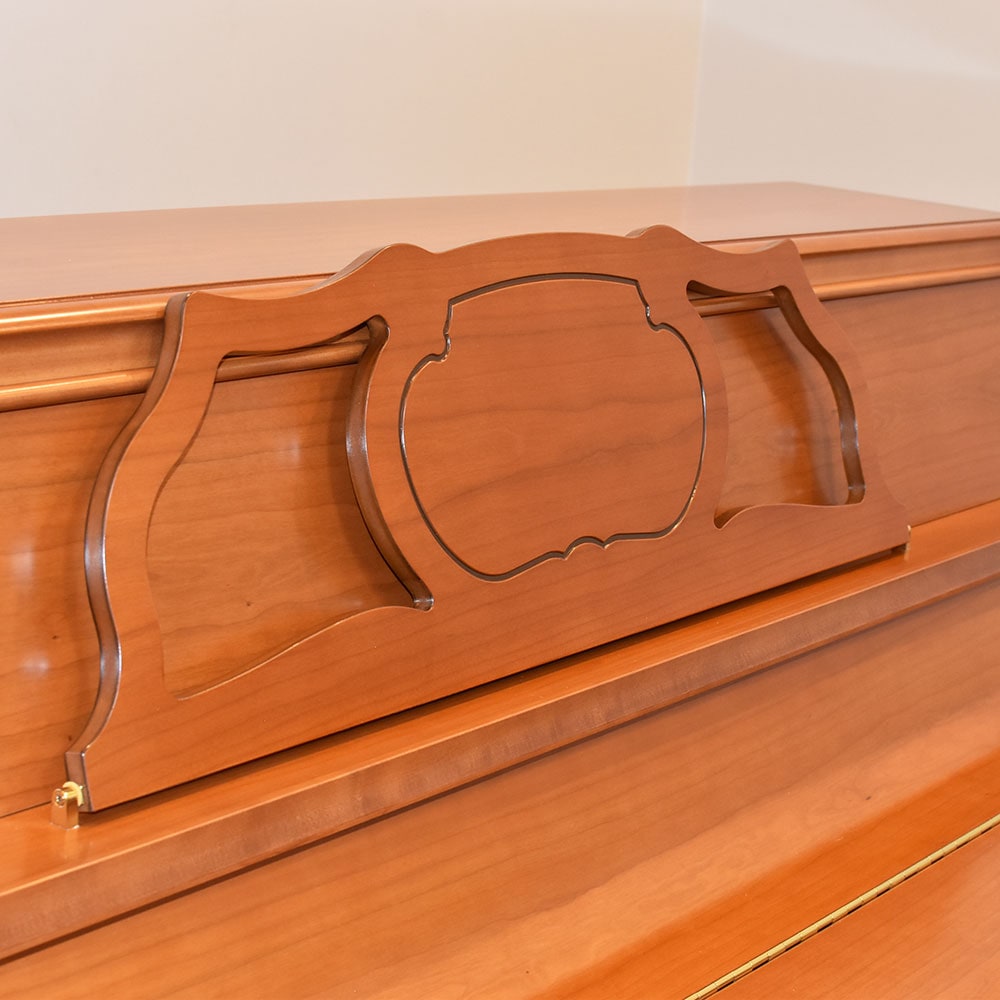 明るくやさしい印象のチェリー外装。 譜面台は曲線を描いた可愛いデザイン。 脚は、猫の脚のように曲線を描き、高級家具のデザインにも使われているチッペンデール様式です。